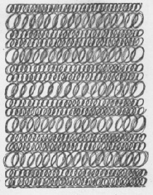 Here are given drills that should be practiced by beginners in muscular movement a few minutes at the beginning of each writing period during several weeks, or until the movement becomes light and elastic and a fair measure of control has been acquired. A movement drill is a repeated form, and it may be a letter or a part of a letter, but it should be so simple in construction and susceptible of such case in execution that the mind is relieved from the tedium of constantly dwelling upon the forms, and can be given to movement study. In number 1 the movement used is in the direction of the capital O, and in order to make the oval very compact all strokes should be very light. One method used in making very compact ovals, is to first carry the ovals across the page with somewhat open spacing and go over the same path again and again, until all white paper disappears. Through this process the fiber of the paper is not picked up by the point of the pen, and the final result is much more pleasing than it otherwise could be. In number 1 not less than 185 downward strokes should be made in a minute, and the same rate of speed should be applied in number 2.