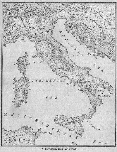 The Leading Facts. 1. Like Greece, Italy is a peninsula, but without many good harbors. 2. At first Rome was only a little village on the river Tiber in the district called Latium. 3. The early Romans resembled the Greeks in many ways, but were much more stern and practical. 4. Their myths were nearly all about war and about brave deeds, like those of Horatius and Cincinnatus. 5. The myths tell how the Romans drove out their kings and set up a republic. 6. In early Rome there were fierce quarrels between the noble patricians and the poor plebeians. 7. The plebeians finally forced the patricians to give them full rights. 8. While the quarrels were going on, the savage Gauls captured and destroyed Rome. 9. After they withdrew, Rome became stronger than ever. Study Questions. 1. How does Italy resemble Greece? 2. What differences do you see between Italy and Greece? 3. Locate Latium. 4. In what ways did the early Romans resemble the Greeks? 5. What do the myths and stories of the Romans show about their character? 6. Tell the story of Romulus and Remus; of Horatius; of Cincinnatus; of Coriolanus. 7. How was Rome governed? 8. Why did the patricians and the plebeians quarrel.? 9. How did the plebeians compel the patricians to grant them their rights? 10. What concessions did the patricians make? 11. Who were the Gauls? 12. How was it that they could capture Rome? 13. Tell the story of their attack on the Capitol as if you were a Gaul who took part. 14. Why were the Gauls willing to leave Rome? 15. Why was Rome stronger than ever after the departure of the Gauls? Suggested Readings. Tappan, The Story of the Roman People, 1-72; Yonge, oung Folks' History of Rome, 13-150; Harding, The City of the Seven Hills, 7-124; Guerber, The Story of the Romans; Haaren and Poland, Famous Men of Rome.