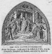 What a ridiculous picture those old heathen must have made as they splashed unwillingly into the water before the weapons of Charles' soldiers! No wonder that the converts had a strange idea of the Religion of Peace! Yet Charles did more than this. He ordered conquered tribes to build churches, and sent priests and monks to live among them. Thusasyearspassed they were gradually taught the meaning of Christianity. As Charles' power grew it seemed more and more as if the good old days of the Roman Empire were coming back again. So when Charles chanced, on one Christmas Day, to be in the city of Rome, an inspiring thing happened. As Charles was kneeling before the altar of the great church, the pope, clad in the stately garments of his office, approached, bearing a crown. This he placed upon the head of the Frankish king and in solemn tones declared him Emperor of Rome. (8oo A.D.) Then all the people shouted, "Long life and victory to the mighty Charles, the great and pacific emperor of the Romans, crowned of God!" And outside the church the rugged soldiers of the king took up the cry.