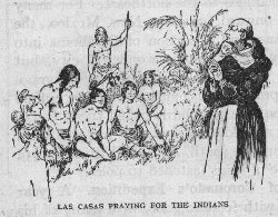 De Soto spent his first winter on Apalachee Bay. In the spring he marched north to Georgia, hunting for a country 116. Discovery of the Mississippi. De Soto found camp for his second winter in northern Mississippi. Here the Indians attacked him again. In the spring the Spaniards moved westward for many days, finally coming upon a great rushing stream—the Mississippi, the Indians called it (1541) On barges, which their own hands had built, De Soto and his men crossed the broad bosom of the Mississippi. Through dense forests that almost hid the sun they marched for days and days together, but found no sign of great riches. They crossed what is now Arkansas, Oklahoma, and perhaps a part of Texas. The winter of 1542 was one of great hardship for all the men. In the following spring, when they reached Mississippi, De Soto was tired, and broken in health. A fever seized the great leader, and in a few days he died. His companions sadly buried him at dead of night beneath the waters of the mighty river he had discovered. Once more the fearless leaders made a dash for the west in the hope of finding rich treasure. They were disappointed, and returned to spend another winter on the banks o the Mississippi. Only half the army was now alive. These men built boats, floated down the Mississippi to its mouth, and finally reached home. De Soto’s expedition discouraged further search in North America for wealth such as South America possessed, but it did extend Spanish claims to this great region. 117. Coronado and the Seven Cities of Cibolo. The Spaniards easily believed most of the stories the Indians told about wonderful cities and their riches. To. the northward the Indians pointed to the Seven Cities of Cibolo. A missionary was sent with Indians to fInd these seven cities, supposed to contain great quantities of treasure. The missionary saw only one from a hill. He feared to go nearer, and returned with wonderful tales. The excitement was great when the missionary’s tales were told. The governor of Mexico prepared a large army and sent it forth under Coronado to conquer the cities. The army contained about three hundred of the sons of Spanish nobility. They wore coats of shining armor, carried lances and swords, and were mounted on the finest horses Mexico could furnish. Many negroes and Indians were taken along as servants to these sons of the nobility. Others went as herders to drive the oxen and to care for the cows which were to be killed as food for the warriors. This army marched northward with high hopes. The men entered southeastern Arizona, crossing mountains and 118. Discovery of the Grand Cañon. In their search the army had divided. Some had gone to explore the Gulf of Upper California and others bad found that wonder of wonders, the Grand Cañon. As they stood upon the plateau-like banks and looked far down into its mighty depths, a distance Of over six thousand feet, or more than a mile, they saw the muddy Colorado rushing along. As they gazed upon this wonderful work of nature, they might have imagined they could see the graywalls of some giant castle, or the red stone of frowning forts built in that far-off time when the gods did battle. Coronado spent his first winter not far from the present city of Albuquerque. He forced the Indians to give their houses to his men, and to furnish them with a supply of blankets. 119. Discover Great Herds of Crooked-Back Oxen. A fresh story told of a wonderful city took Coronado and his men hundreds of miles to the northeast. For many days they pushed onward, crossing New Mexico, the Pan Handle of Texas, and a portion of Oklahoma into Kansas. Here they found, not a wonderful city, but great prairies with their vast oceans of waving grass. Upon these grassy prairies fed countless herds of buffalo —crooked-back oxen, the Spaniards called them. They did see a new kind of Indian. He was more savage than those in the south, and lived in a kind of tent-like house made of skins fastened to poles. 120. Meaning of Coronado’s Expedition. A year later, disappointed, with fortune gone, with many of his gay companions not returning, Coronado reported to the governor of Mexico and proved that those wonderful cities were not to be found. His report that this region was hardly fit for settlers we know to be false, and that there is little of gold or silver in it is not entirely true. They were there, but he did not find them. Coronado’s and De Soto’s expeditions convinced Spaniards that there was little hope of finding gold in the main parts of North America. 121. Las Casas, the Enemy of Human Slavery. The Spanish grandees who led expeditions generally thought themselves above work. Hence they early made slaves of the Indians. But the Indians were not used to working all day long, either in the mines or in the broiling sun. They were accustomed to a great Las Casas was a monk, a just man who loved his neighbor as himself. He tried to influence the Spaniards to do away with Indian slavery, but all in vain. He went to Spain and appealed to the monarch in person, but the high Spanish officers were not in sympathy with his ideas. He continued his battle for the Indian slaves as long as he lived, and had the government officials backed him up, as they should have done, there would have been far less suffering among the red men. The Spaniard had to have help to do his work on the great plantations in the West Indies, in Mexico, and in Central America. After the Indians proved unfit he sought the negroes in Africa. Spain became, in the sixteenth century (1500-1600), the greatest slave trader among the nations of Europe. It was easy, therefore, for the Spaniards in America to get all the black men they wanted. 122. Missions from Peru to California. The great majority of the Spaniards who came, to America were bent upon filling their pockets with gold and upon finding adventures that would test the courage of a true knight. But among them were some who came fo