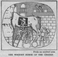 were the perils the brave Argonauts underwent before they at length returned in triumph. 14.The Siege of Troy. But the favorite story of the Hellenes was that told in a wonderful poem, composed, they said, by a blind poet named Homer. If such a man ever lived, surely he was one of the world's greatest poets, for men have never ceased admiring these beautiful verses. He sang how Paris, the son of Priam, King of Troy, a great city in Asia Minor, stole away the fair Helen, wife of Menelaus, king of the Greek city of Sparta. Then Menelaus called upon all the Greeks to help him win Helen back. Nobly they responded, every city in Greece sending its heroes in their long black ships to share in the war. Foremost among them were the strong Ajax, the clever Ulysses, and the swift Achilles, best warrior of Greece. The commander was Agamemnon, brother of the wronged Menelaus. But the Trojans were great fighters. Paris, who had caused all the trouble, proved cowardly, but his brother Hector led them with great courage. For nine years the war went on beneath the wails of Troy. But though the heroes on both sides performed wonderful deeds, neither side prevailed. The gods themselves took part At length Agamemnon, leader of the Greeks, quarreled with Achilles and this brave warrior, retiring to his tent, would no longer fight. Without him the Greeks were defeated, and pursued by the Trojans to their ships. Even these Hector and his stout warriors tried to burn. Seeing his old comrades in such danger, Achilles' best friend, Patroclus, begged that sulky hero to lend him his armor and his followers that he might save the Greeks from destruction. This request Achilles granted, and his friend drove back the Trojans, but was soon afterwards slain by Hector. Driven by rage at the death of his dear friend, Achilles now rushed forth and, clad in new and wonderful armor made for him by the god Vulcan, carried all before him. At last he and Hector met in single combat beneath the walls of Troy, and the Trojan chief fell before his terrible spear. With the revenge of Achilles, Homer's great poem ends. Other stories, however, told how Achilles, too, was slain and how at length Troy was taken by a clever trick of Ulysses. The Greeks pretended to sail home, but left behind a great wooden horse which the foolish Trojans dragged inside their city: It proved to be filled with Greek warriors, who at dead of night opened the gates and let in their countrymen, who had now returned. Trov was given over to fire and sword, and Menelaus and the Greeks sailed for home in triumph, bearing Helen with them to be once more Queen of Sparta. The Greeks never tired of reciting this thrilling story, in which they believed the deeds of their forefathers were set forth. Almost equal pleasure did they find in another tale which Homer sang, -that of the wanderings of Ulysses. This famous chief thad offended the god Neptune and therefore, when he sailed from Troy, his ship The Leading Facts. 1. The first civilized people of Europe were the Greeks. 2. The Greeks have taught all the -world to admire beautiful things. 3. They gave us also the beginnings of most of the subjects now taught in schools and colleges. 4. Greece is a small, mountainous country, every part of which is near the sea. 5. In ancient times the Greeks were brave sailors, and planted colonies on all the neighboring coasts. 6. The Greeks worshiped many gods and goddesses, about whom they told beautiful but curious stories. 7. They had also many stories regarding heroes such as Hercules, Theseus, and Jason. 8. The most famous stories are about the siege of Troy and the wanderings of Ulysses. 9. These are told in two wonderful poems said to have been composed by a blind poet named Homer. Study Questions. 1. What are some of the things we know which the Greeks did not know? 2. State some things which the Greeks understood better, or cared more for, than we do. 3. Describe Greece. 4. Why do you think the ancient Greeks became sailors? 5. In what places did they plant colonies? 6. Name the chief gods and goddesses of Olympus. 7. How did the Greeks show that their belief in these deities was real? 8. Tell an incident connected with Hercules; Theseus; Jason. 9. Name some of the heroes of the Trojan War. 10. Tell the story of the revenge of Achilles.. 11. How was Troy finally taken? 12. Why did the Greeks especially admire Ulysses? Suggested Readings. Guerber, The Story of the Greeks, 11-62; Harding, Stories of Greek Gods, Heroes, and Men; Lang, Tales of Troy and Greece, 9-61, 111-129, 159-188; Gale, Achilles and Hector, 13-143; Kingsley, The Heroes, or, Greek Fairy Tales for My Children, "The Argonauts," 87-253; Church, The Story of the Iliad, I-16, 109-155; The Story of the Odyssey, 13-204, 261-307; De Garmo, Tales of Troy for Boys and Girls; Retold from "St. Nicholas": Stories of Classic Myths, 3-68; Buffinch, Age of Fable, or Stories of Gods and Heroes, 1-12, 16 1-170, 178-188, 190-191.