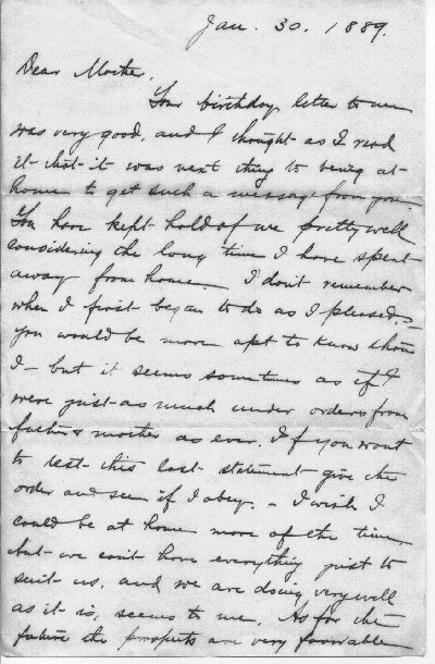![]() Any words not readily translatable will be so indicated in brackets { } with the closest translation possible. To read the actual letter, click on the page above. Jan. 30, 1889 Dear Mother Your birthday letter to me was very good and I thought as I read it that it was next thing to being at home to get such a message from you. You have kept hold of me pretty well considering the long time I have spent away from home. I don't remember when I first began to do as I pleased. You would be more apt to know that I--but it seems sometimes as if I were just as much under orders from father & mother as ever. If you want to test this last statement--give the order and see if I obey. I wish I could be at home more of the time, but we can't have everything just to suit us, and we are doing very well as it is, seems to me. As for the future the prospects are very favorable and on the whole, we are quite content, I think. Now, of course, I am speaking for my part, but I think you & father feel as I do, unless the asthma sometimes drives contentment away from you for a while. I hope you are getting better and preparing for a good spring and summer. Willard has said about all there is to say in the way of news. We are doing well and having a good time generally. I have a big lot of work in store for the second half year, which begins Monday, but I expect to get through it somehow, just as I have former ocassions. Botany is new to me and I am surprised to see how little I know but I shall study and work as hard as seems advisable. Give my regards to all the good people, with much love for yourseles. Your affectionate son, Frank I will pay Mrs. Co?huff.