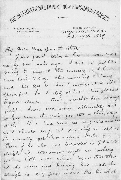 ![]() Any words not readily translatable will be so indicated in brackets { } with the closest translation possible. To read the actual letter, click on the page above. Feb 14th 1889 My Dear Grandpa & the others. Your jovil letter to F. & me was recd. nearly two weeks ago. I did not feel like going to church this evening as I have been twice today. This morning to Coug. and this P.M. to choral service at Trinity Episcopal. So I stay at home tonight and F. goes alone. Our weather here is very fickle. Snow and rain alternately and it has been {unreadable} rain for two or three days past. There has been no very cold weather as I should say, but probably as cold as it usually gets here--about 4° below zero. Those of us who are interested in Y.P.S. C.E. sleigh ride tomorrow night are wishing for a little more snow before that time as the rain and thawing has made the sleighing very poor indeed. On the whole the winter has been unusually mild as it is generally more steady and not so much rain or thawing weather. We were not much surprised of course to hear of Mr. Francis' death knowing how feeble he was, and can only say it is the relief and rest he has so long and patiently waited for. I do hope Uncle James is well of his cold by this time. My occupation since coming to Buffalo has not amounted to a great deal as yet, but I am in hopes it will be more renumerative in the future. This Association is rather a new concern having been started about 8 months ago by two enterprising young men. But is seems to be a very plausable and popular scheme and it seems to me is meeting with a success and support so far that is very encouraging. They understake to do a general purchasing business and have gone so far as to make it appear that their possibilities in that direction are almost unlimited in variety. They of course are of more interest to those whose purchases are necessarily large such as physicians, architects, etc., in the purchase of books, instruments, drugs, & other necessaries. They get whole-sale rates on every class of goods and usually buy directly from the publisher, manufacturer or wholesale dealer. They buy only for their membes and charge a membership fee of $10 for 3 years or $5 for one. I have been with them over 6 weeks and my work has been soliciting memberships among physicians principally. They want me to stay with them and are offering me full charge of their books & some other office work at a small salary besides management of agents in N.Y. with a commission and general supervision over other state agents who may be given territory and a commission on all memberships which are added to the agency. They are rather small potatoes comparatively, yet, but I am about the first one with them and think will give me quite a preferece so if the business grows as it promises it will pay to grow with it. I will be seen to make my living while I stay at any rate. Can tell you more about it later on. I suppose it is not worth while to tell you of all the calls we make every place we go evenings. We usualy have good times and try to go to the best when we do go. We had a very pleasant call at the house of Alvan Barrows two weeks or so ago. It was late when we went and Alvan B. had retired but we had a pleasant visit with his son and wife and her mother. They are very cordial indeed and we shall try to go often. We are making new acquaintances occassionally and {unreadable} are calls, church socials, teas and ever so many things to go to. But I think we're pretty good considering it all, and spend on an average two evenings a week at home. Last Tuesday evening I heard Bishop Vincent give his lecture on "That Boy". Very interesting indeed. I enjoy hearing the Bishop very much and propose to go as often as possible when he is to speak. There is to be an excursion to Rochester the 22nd. Fare only $1.50 round trip, but I do not expect to go. There will be excursions frequently during the spring and summer and I want to take in some of them if possible. I sent you a paper containing an account of the fire we had here. We were much disappointed in not seeing it in its glory. Went to bed very late and was very sound asleep. The folks in the house saw the light but did not hardly realize what it was and so did not rouse us up. The ruins present a very ghastly appearance. Three or four engines did not stop pumping until the second night after the fire. I attended an exhibition drill of the 65th regt. at the armory one evening last week. The drill room is the second largest in the state I think. It was very interesting. One thing I enjoy and appreciate here very much is the Library. I can find so many books there which I want to read and might not have the opportunity any where else. The reading room is also very complete. Every week there are two or more scientific lectures in the library. I have a good letter from John Morrison yesterday or day before. He wrote from Central City, Nebr. Is selling Harper's text books in that region and seems to be doing fairly well. Was in Osceola not long since. Saw some of the folks there & took {Annie with Ed Cheero?} with. I think John is having some very good experience in working around in so many different schemes and will some time find himself in a good paying business. Mr. Rossi's people are doing as well as usual. Mr. R. made a short visit in Can and returned to Oseola some time since accompanied by a sister from {unreadable} who is still with them. She is by no means well, but probably on the whole somewhat improved. Keeps her bed considerably I should think from what is said. Perhaps you remember that Mr. J. P. Heald's wife died last May or June. Well he has already been paying so much attention to a lady school teacher in town that there is considerable gossip about it, and it is said they make themselves as ridiculous as two young persons just beginning to keep company. Tell Aunt A. I am obliged to her for her offer to make application for a situ