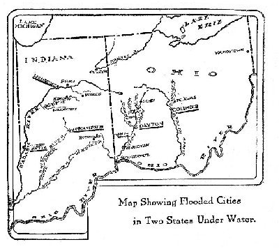 "A great mountain of water has been hurled from the clouds upon Ohio," said a graphic writer in the Cleveland Leader on March 27. "A lake has been emptied upon this state. "The rainfall since Sunday morning must have been not less than six inches, on the average, over the 41,000 odd square miles inside the limits of the commonwealth. That precipitation is indicated by the Cleveland record and other figures from various points. "Six inches of rain throughout Ohio means about 575,000,000,000 cubic feet of water. That is equivalent to a lake ten feet deep, 80 miles long and 25 miles in average width. It would make a lake 20 feet deep, 40 miles long and 25 miles wide, throughout its length. "Put this enormous mass of water in another form and it would fill a gigantic standpipe a mile in diameter and about five miles high. It would overflow such an incredible tank towering far above the top of the highest mountain in North America. "The weight of such a mass of water is monstrous. Roughly speaking—for all statistics of the rainfall in the state must necessarily be general and loosely put together—the rain which has come down in Ohio in three days means about 18,000,000,000 tons. "That is more than all the coal mined in America since the first pound was taken from the ground. It makes the weight of all the iron ore ever produced in all the world look small by contrast. "If the water which has been rained down upon Ohio since the present week began could be put in the balance against the products of the farms of the United States it would outweigh all the grain and all the hay of half a century, at the current rate of production, with all the fruit added. "Inside the city limits of Cleveland, a little patch of ground compared with the area of the state or even the Cuyahoga valley, enough water has fallen in three days to outweigh, by a wide margin, all the iron ore received at this port in the best year lake shipping ever enjoyed, and all the coal shipped. The rainfall in the city has been about equal to a year’s output of the coal mines of Ohio. "Enough water has fallen inside the municipal limits to make a lake two miles long, a mile wide and ten feet deep. Or it would fill a reservoir fifty feet deep, half a mile wide and only a little less than a mile long. "Human dams, bridges, levees, walls and other structures have had to meet the force of weights and masses so stupendous that ordinary figures lose their significance by contrast with the water which has flooded Ohio valleys and lowlands." ![]() Four rivers caused the principal flood damage in Ohio and Indiana, as follows: Miami River—It flows through alluvial valleys in a raised bed, with a slow current and low banks. Rising on the low watershed in the central district of Ohio, it flows past Hamilton, Dayton, Troy, Piqua, Sidney, Middletown, Miamisburg and other busy cities, all heavy sufferers from the flood. It empties into the Ohio at the southwest corner of the state, at the Indiana line. Scioto River—It rises in the central watershed of the state of Ohio and enters the Ohio river at Portsmouth. Columbus, Circleville and Chillicothe are also situated on its banks. Of these cities Columbus was the chief sufferer. Wabash River—It rises in the Ohio watershed and soon flows into Indiana. Among the many cities on its banks, Peru, sixteen miles east of Logansport, suffered most. Terre Haute, also a heavy sufferer from recent storms and from the tornado that struck it Sunday afternoon, March 23, was hurt by the flood in the river section. Lafayette was partially submerged. White River—A tributary of the Wabash. The west fork of this river caused the great losses in West Indianapolis. These southward flowing rivers, situated in a rich, level agricultural country and yet having on their banks cities swarming with profitable manufactories which have grown up because of the splendid transportation, cheap coal and natural gas, were gorged by torrential rains falling in a broad, deforested section of highly cultivated and tilled farm lands, so that the runoff was immediate. Thus the floods came with terrible suddenness, drowning many almost before they had realized their peril. Continue Back Back to Legacy © 2001, Lynn Waterman |