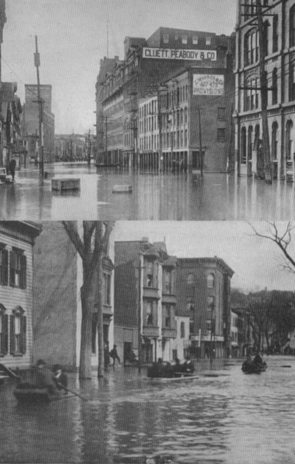 Top picture—In the heart of the world-famous collar and cuff district of Troy, N. Y., at the height of the flood of 1913.