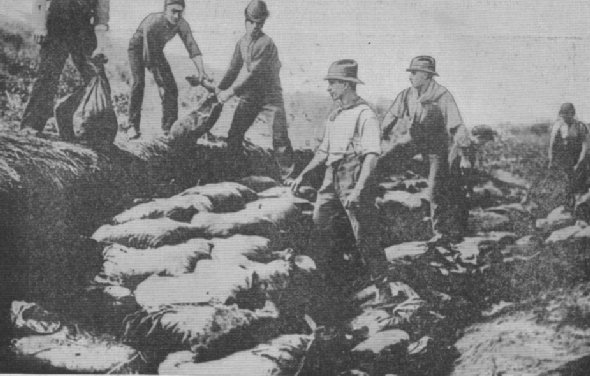Residents of threatened districts worked day and night building dikes with sand bags to keep out the water.