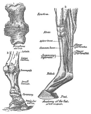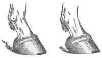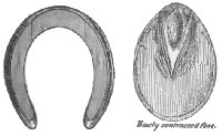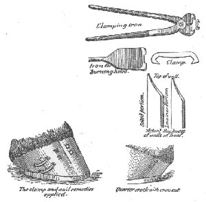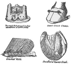 ![]() When contraction comes from bad shoeing or from standing on hard floors, pull the shoes off, pare down the foot as much as you can, leaving the frog as large as it is. Rub in some hoof ointment once a day at the coronet and quarters, and turn the horse out in a wet pasture. But if the horse must be used on the road, proceed to shoe as follows: First, ascertain if the frog is hard or soft. If soft, put on a bar shoe with open bar. I have invented a shoe for this purpose. See Fig. 2, No. 1. The idea of shoeing with an endless bar shoe is wrong. In most cases contraction is brought on by letting the shoes stay on too long, whereby the hoof has been compelled to grow down with the shape of the shoe. ![]() Make a low box and fill it with wet manure, mud or clay, and let the horse stand in it when convenient, to soften the hoofs. Spread the shoe a little every week to help the hoofs out, or the shoes will prevent what the frog pressure aims to do, but this spreading must be done with care. If the frog is dried up and hard, don't put on a bar shoe, as it will do more harm than good. In such a case make a common shoe with low or no calks; make holes in it as far back as you can nail; spread them with care a little every week. Let the horse stand in a box with mud or manure, even warm water, for a few hours at a time, and keep the hoofs moist with hoof ointment. In either case do not let the shoe stay on longer than four weeks at a time. In addition to the above pack the feet with some wet packing, or a sponge can be applied to the feet and held in position by some of the many inventions for this purpose. No man can comprehend how much a horse suffers from contraction when his feet are hoof-bound and pressed together as if they were in a vise. The pain from a pair of hard and tight boots on a man are nothing compared to the agony endured by this noble and silent sufferer. It must be remembered that there is no such a thing as shoeing for contraction. Contraction is brought on by artificial living and shoeing. A bar shoe for contraction is the most foolish thing to imagine. The pressure intended on the frog is a dead pressure, and in a few days it will settle itself so that there is no pressure at all. If a bar shoe is to be used it must be an open bar shoe like the one referred to. This shoe will give a live pressure, and if made of steel will spring up against the frog at every step and it can be spread. I will say, however, that I don't recommend spreading, for it will part if not done with care. It is better to drive the shoe on with only four or five nails, and set them over often. ![]() Corns are very common to horses' feet, a majority of all cases of lameness is due to this trouble. Corns are the result of shoes being allowed to stay on too long. The shoe, in such a case grows under the foot and presses on the sole and corns are formed. Even pressure of the shoe and sometimes too heavy bearing on the heel causes corns. Gravel wedging in under the shoe or between the bar and the wall is sometimes the cause of corns. Leaving the heel and quarters too high, whereby they will bend under and press against the sole, is another cause of corns. The seat of corns is generally in the sole of the foot at the quarter or heels between the bar and the wall, at the angle made by the wall and bar. Anything that will bruise the underlying and sensitive membrane of the sole will produce corn. This bruise gives rise to soreness, the sole becomes blood colored and reddish: if bad it might break out, either at the bottom or the junction of the hoof and hair or coronet, forming a quittor. Cut out the corn or red sole clear down. If the corn is the result of contraction pare down the hoof and sole, put the foot into linseed poultice that is warm, for twenty-four hours, then renew it. If the corn is deep, be sure to cut down enough to let the matter out. It is a good thing to pour into the hole hot pine tar. In shoeing the bearing should he taken off the quarter or from the wall over the corn by rasping it down so that it will not touch the shoe. A bar shoe is a good thing as it will not spring as much as to come in contact with the hoof over the corn. Give very little frog pressure. An open shoe can be used and in ![]() such a case there should be no calk at the heel. A calk should be welded on directly over the corn and the shoe will not spring up against the wall. Quarter and sand cracks are cracks in the hoof, usually running lengthwise of the fibers, but sometimes they will be running across the fiber for an inch or more.