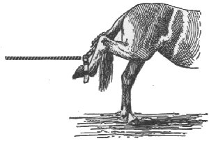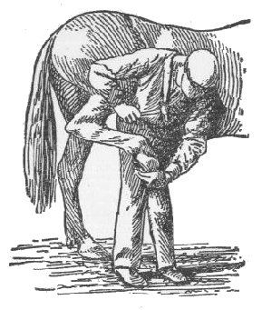 ![]() Quarter cracks are cracks mostly on the inside of the hoof, because that side is thinner and weaker than the outside. The cause of it is a hard and brittle hoof with no elasticity, brought on by poor assimilation and a want of good nutrition to the hoof. Hot, sandy or hard roads are also conducive to these cracks. What to do: If the horse is shod remove the shoes, and cut off the wall of the quarter to take off the bearing on both sides of the crack. If the crack goes up to the coronet and is deep, cut off both sides of the crack the whole length. About one inch below the coronet, cut a deep cut clear through either with a knife or hot sharp iron across the crack. This will help to start a new hoof. If the flesh sticks up between the cracks, let a veterinarian burn it off. In shoeing for this trouble, it is best to use a bar shoe (endless) and shoe the horse often. When shoes with a clip or a cap on the toe are used it sometimes happens that the toe is bruised and it starts a dry rot extending up between the wall and the laminæ. Remove the shoe, pare away the hoof at the toe so as to take away the bearing from the toe. Any white or meaty substance should be picked out. Apply hot pine tar into the hole, and clip a little wad of tow in the hole to fill up. Replace the shoe, but don't let the clip touch the wall. Pricking often happens in shoeing from a nail running into the quick, but the horse is often pricked by stepping on a nail or anything that will penetrate the sole and run into the quick. If the horse is pricked by shoeing pull off the shoes and examine each nail, the nail which has gone into the quick is wet and of a blue color. If it is a bad case the sole or wall must be cut down to let the matter out and the foot put into a boot of linseed poultice. In milder cases a little pine tar put into the hole will be enough. Mistakes are often made by inexperienced men and horse-shoers when a case of this kind is to be treated, and I would advise every horse-shoer to call in a veterinarian when he gets a case of this kind. Cramps of the muscles of the thighs are sometimes taken for stifle. When stifle appears in an old horse, three ounces of lead through his brain is the best, but for a young horse a cruel method of shoeing might be tried. Make a shoe with heels three inches high, or a shoe with cross bands as shown in illustration, Figure 8, No. 2, for stifle shoe. This shoe must be placed on the well foot. The idea is to have the horse stand on the stifled leg until the muscles and cords are relaxed. String halt or spring halt is a kind of affection of the hind legs, occasioning a sudden jerk of the legs upward towards the belly. Sometimes only one leg is affected. In some cases it is milder, in others more severe. In some cases it is difficult to start the horse. He will jerk up on one leg and then on the other, but when started will go along all right. For this fault there is no cure because it is a nervous affection. If there is any local disorder it is best to treat this, as it might alleviate the jerk. For the jerk itself bathe the hind quarters once a day with cold water. If this don't help try warm water, once a day for two weeks. Rub the quarters dry after bathing. Many devices are now gotten up for shoeing kicking horses. It is no use for a man to wrestle with a horse, and every horse-shoer should try to find out the best way to handle vicious horses. One simple way, which will answer in most cases, is to put a twist on one of the horse's lips or on one ear. To make a twist, take a piece of broom handle two feet long, bore a half-inch hole in one end and put a piece of a clothes line through so as to make a loop six inches in diameter. Another way: Make a leather strap with a ring in, put this strap around the foot of the horse; in the ring of the strap tie a rope. Now braid or tie a ring in the horse's tail and run the rope through this ring and back through the ring in the strap, then pull the foot up. See Fig. 16. The front foot can he held up by this device also, by simply buckling the strap to the foot and throwing the strap up over the neck of the horse. Shoeing stalls are also used, but they are yet too expensive for small shops. No horse-shoer should lose his temper in handling a nervous horse and abuse the animal; for, in nine cases out of ten, will hard treatment make the horse worse, and many horse owners would rather be hit themselves than to have anybody hit their horse.
