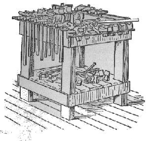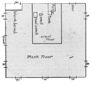 Have plenty of ventilation. Make it one story only if convenient to do so, as an upper story in a blacksmith shop is of very little use. The shop is the place where the smith spends most of his time and he should take just as much care in building it, as a sensible housekeeper does in the construction of her kitchen. The forge can be made either single or double, square or round. The square is the best as it can be placed up against the wall, and you will then have more room in front of it. The round forge will take more room, if it is placed in the center of the floor there will be no room of any amount on any side and when the doors are open the wind will blow the fire, cinders and smoke into the face of the smith. This is very uncomfortable. The smokestack, if hung over the fire will sometimes be in the way. Of course the hood can be made in halves and one half swung to the side, but it will sometimes be in the way anyhow, and it seldom has any suction to carry away the smoke and cinders. ![]() The anvil should not be too close to the forge, as is often the case in small country shops. Make it six feet from center of fire to center of anvil. The anvil should not be placed on a butcher block with the tools on, but on a timber the same size as the foot of the anvil. Set the timber down in the ground at least three feet. For heavy work the anvil should stand low in order to be able to come down on it with both hammer and sledge with force. When the smith has his hands closed the knuckles of his fingers should touch the face of the anvil and it will be the right height for all-around blacksmithing. Close to the forge under the water tank or barrel should be a coal box 18 X 24 X 16 inches, this box to be dug down in the ground and so placed that one end will protrude from under the barrel or tank far enough to let a shovel in. This opening can be closed with a lid if the tools are liable to fall into it. In this box keep the coal wet. In figure 1 a plan is given from which you can get an idea of a shop and how to place the tools and different articles needed. On the right hand of the anvil should be a tool bench or tool table 20 x 20, a little lower than the anvil. Outside, on three sides and level with the table, make a railing of 1 1/4 inch iron, about 1 1/2 inch space between the table and railing, this makes a handy place for tools and near by. Many blacksmiths have no other place than the floor for their tools, but there is no more sense in that than it would be for a carpenter to throw his tools down on the floor all around him. There ought to be "a place for every tool and every tool in its place."