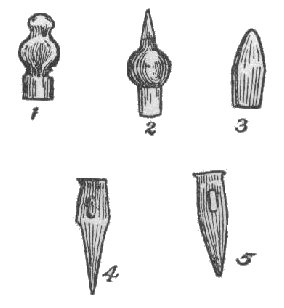 For ordinary blacksmithing a flat peen hammer is the thing, but I have seen good blacksmiths hang on to the machinist's hammer as the only thing. See No. 1, Figure 5. This hammer is more ornamental than useful in a blacksmith shop. The hammer should be of different sizes for different work, light for light work, and for drawing out plowshares alone the hammer should be heavy. For an ordinary smith a hammer of two up to two and one-half pounds is right. Riveting hammers should be only one pound and less. No smith should ever use a hammer like No. 3, in Figure 5. This hammer I have not yet been able to find out what it is good for. Too short, too clumsy, too much friction in the air. I have christened it, and if you want my name for it call it Cain's hammer. It must surely look like the hammer used by him, if he had any. A chisel for hot cutting, see Figure 5, No. 4. This chisel is made of 1 ¼ square tool steel. Punch a hole 1 1/8 x ¼ x ½ about three inches from the end, the eye should be narrow in order to leave material enough on the sides to give it strength. When eye is finished, forge down below it, not on the head-end, with top and bottom fullers, like cut. This gives the chisel a better shape. Now dress down the edge, then heat to a low cherry red, and harden, brighten it and when the color is brown cool off. Use same sized steel as above referred to, make it like No. 5, Figure 5. To distinguish it from the hot cutting chisel, and to give it more strength, in hardening this chisel, draw the temper until it is blue. This is the right temper for all kinds of cold chisels. One might think that anybody knows how to make a set hammer, if every smith knows it, I don't know, but I do know that there are thousands of smiths who have never had a set hammer nor know its use. To make one: Take a piece of tool steel 1 ¼ x 1 ¼ inches, punch a hole about two inches from the end, the hole to be 1 ¼ x 3/8. Now cut off enough for head. Make the face perfectly square and level, with sharp corners, harden and cool off when the temper turns from brown to blue. This is a very important little tool and for cutting steel it is a good deal better than the chisel. Plow steel of every kind is easier cut with this hammer than any other way. In cutting with the set hammer hold the steel so that your inner side of the set hammer will be over the outside edge of the anvil. Let the helper strike on the outside corner of the set hammer and it will cut easy. The steel to be cut should be just a little hot, not enough to be noticed. If the steel is red hot the set hammer cannot cut it. The heat must be what is called blue heat. I would not be without the set hammer for money, and still I often meet smiths who have never seen this use made of the set hammer. Plow points, corn shovels, and seeder shovels are quicker cut with this tool than any other way, with the exception of shears. Twist drills are not easy to make by hand, as they should be turned to be true, but a twist drill can be made this way. Take a piece of tool steel round and the size of the chuck hole in your drill press. Flatten it down to the size wanted, heat, put the shank in the vise, take with the tongs over the end and give one turn to the whole length, turn to the left. When finished be sure that it is not thicker up than it is at point, and straight. Now harden, heat to a low cherry red, cool off in luke-warm water—salt water, if you have it—brighten it and hold over a hot bar of iron to draw temper, cool off when brown, the whole length of the twist should be tempered. Another way to make a drill is to just flatten the steel and shape to a diamond point and bend the shares forward. This is a simple but good idea and such drills cut easy. In cooling for hardening turn the drill in the water so that the edge or shares are cooled in proportion to point, or the shares will be too soft and the point of such a drill too hard. Our trade journals, in giving receipts for hardening drills, often get watch-makers receipts. This is misleading: