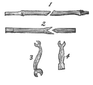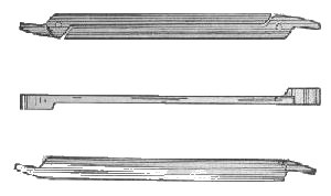 Simple soft water and the right heat is, in most cases, the only thing needed for hardening. I had occasion to consult a doctor once who was noted for his simple remedies. A lady got some medicine and she wanted to know what it was so she could get it when the doctor was not at home, but he refused to reveal it to her. When the lady had left the doctor told me the reason why. "This lady," said the doctor, "does not believe in simple remedies which she knows, but believes in those remedies she knows nothing about." I think it is better for us to try to understand things and not believe much in them before we understand them. See Figure 6, No. 3. This wrench is for 3/8 nut on one end and ½ on the other, just the kind for plow work. To make one, take a piece of tool steel 1 ½ x 5/8 start as you see in No. 4, Figure 6. Set the jaws down with the fullers, punch a round hole as in end No. 4, cut out from hole and finish the jaws to make the right length, now bend it in S shape and finish. This makes the best wrench. Do not heat over a red heat. Few blacksmiths know how to make a rock drill. Take a piece of round or octagon steel, the desired length and thickness, shape it, but it must be remembered that if during the process you ever get it over a red heat there is no use to proceed, but just cut off that much and start again, no hardening will prevail if it is burnt. The trouble begins when you put the steel into the fire, and you must watch until you have it finished. When ready to harden heat it to a cherry red heat, cool in water not too cold, brighten and watch for temper. When it is yellow, cool it off, but not entirely, take it out of the water before it is quite cold and let it cool slowly, this will make the drill both hard and tough. By this simple process I have been able to dress drills and get such a good temper than only two per cent would break. Another way to harden is to heat to a very low heat and cool it off entirely at once. A third way is to temper as first stated and when yellow set the drill in water only one half an inch deep and let it cool. By this process a good per cent will break just at the water line. |