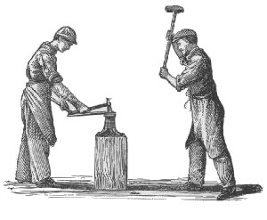 RULES FOR SMITH AND HELPER HE smith should never turn the iron on the helper's blow, he should turn on his own blow, that is, never turn the iron so that the helper's blow will hit it first because he is not prepared for it and cannot strike with confidence, but the smith will not be bothered by turning the iron for himself as he knows when he turns and is prepared for it. The smith should strike the first blow in starting, or signal the helper where to strike, in case the smith cannot strike the first blow. The smith calls the helper by three blows on the anvil with his hammer, and when the smith wants the helper to cease striking he taps with the hammer twice on the anvil. The helper should strike the blow he has started when the smith signals him to stop. The helper should watch the time of the smith's hammer; if fast, keep time with it, if slow, keep time with it. The helper should strike where the smith strikes or over the center of the anvil. The helper should always lift the sledge high, in order to give the smith a chance to get in with the hammer.