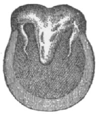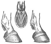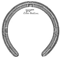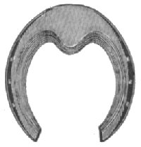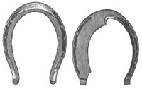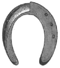 The best way to shoe a forger or overreaching horse is to make a shoe for front of medium heft, not longer than just what is needed. The toe calk should be at the inner web of the shoe, or no toe calk at all, or, toe weight, to make the horse reach farther. It will sometimes be found that the hind foot is shorter than the front foot. To find this out, measure from the coronet to the end of the toe. The shorter the foot the quicker it breaks over. If it is found that the hind foot is shorter than the front foot, then the shoe should be made so that it will make up for this. Let the shoe stick out on the toe enough to make the foot of equal length with the front foot. It is well in any case of forging to make the hind shoe longer on the toe. If the hind shoe is back on the foot, as is often done, it will only make the horse forge all the more, for it will increase action behind, the horse breaks over quicker, and strikes the front foot before it is out of the way. Set the shoe forward as far as possible, and make long heels. The longer the shoe is behind the longer it takes to raise the foot and break over. Clack forging is meant by the habit of clacking the hind and fore-shoes together. This kind of forging is not serious or harmful; it will only tend to wear off the toe of the hind foot and annoy the driver, possibly a little fatiguing to the horse. The position of the feet at the time of the clack is different from that it is supposed to be. The toe of the hind feet is generally worn off, while no mark is made on the front feet. From this you will understand that the hind feet never touch the heel of the front feet, but the shoe. Just at the moment the fore foot is raised up enough on the heel to give room for the hind foot to wedge in under it the hind foot comes flying under the fore foot, and the toe of the hind foot strikes the web of the toe on ![]() Interfering is a bad fault in a horse. It is the effect of a variety of causes. In interfering the horse brushes the foot going forward against the other foot. Some horses strike the knee, others above it, the shin or coronet, but in most cases the fetlock. Colts seldom interfere before they are shod, but then they sometimes interfere because the shoes are too heavy. This trouble disappears as soon as the colt is accustomed to carrying the shoes. Weakness is the most common cause. Malformation of the fetlock is another cause. The turning in or out of the toes, giving a swinging motion to the feet, is also conducive to interfering. The first thing to do is to apply a boot to the place that is brushed. Next, proceed to remove the cause by shoeing, or by feeding and rest in cases of weakness. Nothing is better than flesh to spread the legs