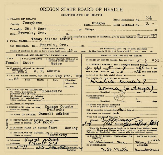 ----Source: Death Certificate, Josephine County, Oregon, USA