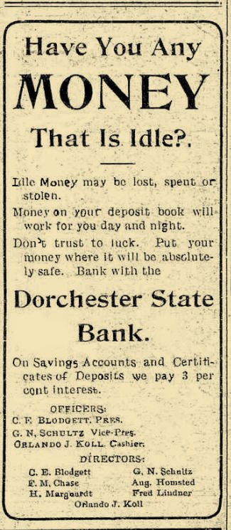 The advertisement below was scanned from the "Clark County Herald", 17 Apr 1908, for the Dorchester State Bank in Dorchester, WI.