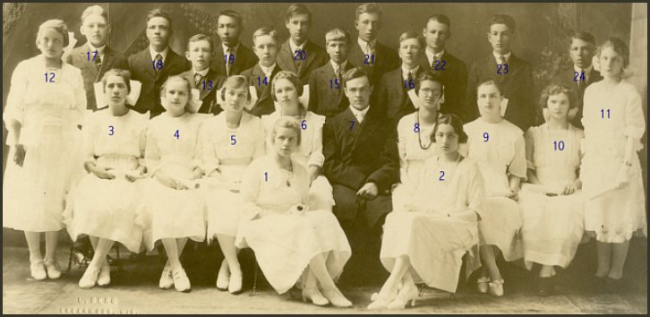 We are in the process of identifying the members of this class from the photo above. If you have any additions or corrections, please contact us. 1. Sophie Franz, 2. Mabel Schlingsog, 3. Irene Humke, 4.Martha Mueller/Miller, 5. , 6. , 7. , 8. , 9. , 10. Rose Haase Horn, 11. , 12. Laura Buker, 13. Rudolph Erzinger, 14. Theodore Abel, 15. Emil Franz, 16. Richard Schwarze, 17. Phillip Vollrath, 18. Raymond Brick, 19. Alvin Stacy, 20. Walter Brick, 21. Albert Abel, 22. Alvin Schwarze, 23. Eddy Kuester, 24.