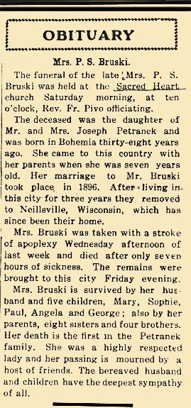 The Funeral Was Held From Sacred Heart Catholic Church Last Saturday Morning. The remains of the late Mrs. Peter Bruski, who died at her home near Neillsville, Wisconsin, on Wednesday, March 3rd, of apoplexy, were brought to this city and taken to the home of her sister, Mrs. Louis Walecka. The funeral services were conducted by Father Pivo from the Sacred Heart Catholic church Saturday morning at 10 o'clock. The interment was made in the Catholic cemetery. The maiden name of the deceased was Agnes Petronek. She was born in Bohemia and was aged thirty-six years. She came with her parents to this city in the early day. She was married to Peter Bruski in 1896. There was born to them five children. Mr. and Mrs. Bruski made their home for a time in Owatonna and about ten years ago moved onto a farm near Neillsville, Wisconsin. The decedent was a Christian woman held in the highest respect and esteem by all of her acquaintances. She was a kind true wife, a good mother and most excellent friend. The decedent is survived by a sorrowing husband and two sons, Paul and George, and three daughters, May, Sophia and Angelia, also her aged parents, Mr. and Mrs. Joseph Petronek, and brothers, Joseph, Alfred, Iven and Frank, and sisters, Mrs. Louis Walechka, Mrs. Peter Steinbauer, Christine, Matilda, Sophia, Frances and Harriet Petronek. The bereaved relatives have the sympathy of the entire community.