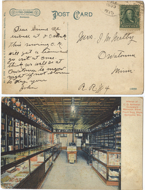 The Card below features an interior view of the C. C. Sniteman Company's Front Drug Store as it appeared in 1909 in Neillsville, Wis.