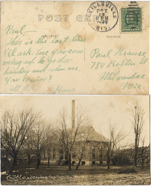 This old card featuring the Neillsville Waterworks was sent to Paul Krause, 780 Holtoors St., Milwaukee, Wis. Oct. 17, 1909 from Neillsville.