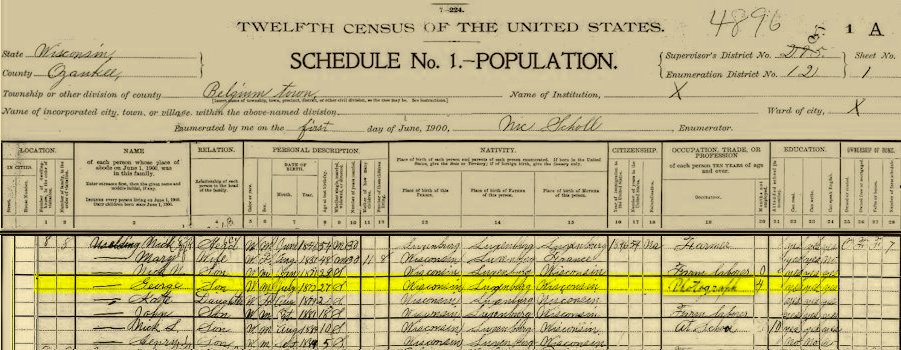 George Uselding was born 21 Jul 1872 to Nicholas (1845–1932) & Cattin Maria Frederiss (1850–1932) Uselding who had married about 1870 in Belgium, Ozaukee, Wisconsin. George owned a farm in