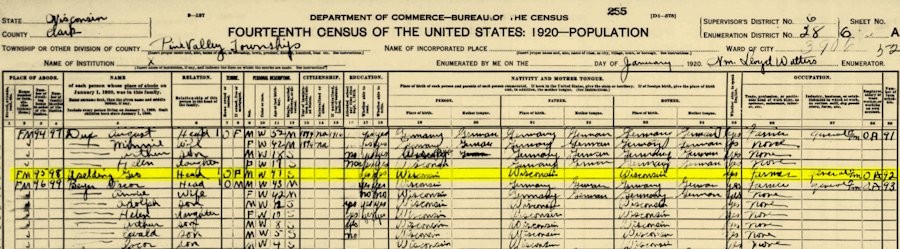 Brother: Harry Uselding 34 (1895), b. Wisconsin, single; Occupation: Farmer /