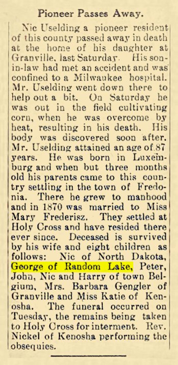 George Uselding, Male, resided in Random Lake, WI. Died at the age of 50 yrs. in Neillsville, WI 21 May 1923 and was buried in the Holy Cross Cemetery, Belgium, Ozaukee County, Wisconsin.
