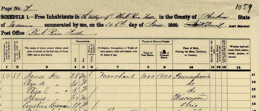 1860 Federal Census, Village of Black River Falls, Jackson, Wisconsin, United States