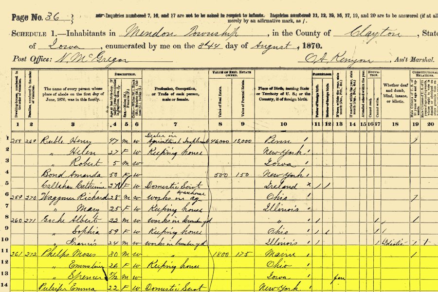 1870 Federal Census, Mendon Township, Clayton, Iowa, United States