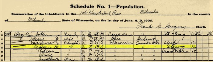 Mary E Doyle Daughter Female 19y Wisconsin, stenographer