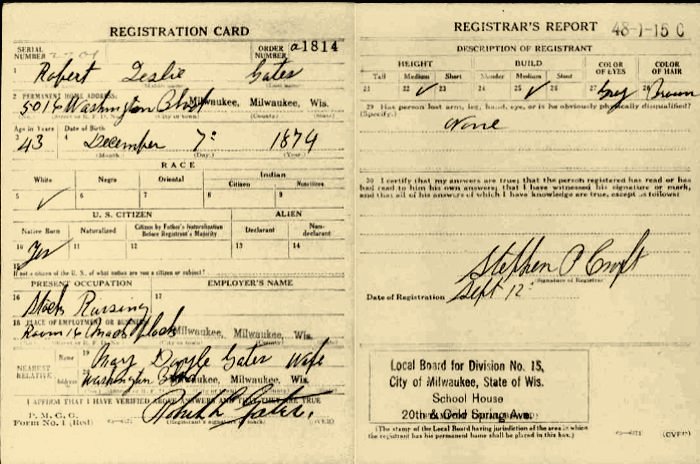Robert Leslie Gates; white native born male, age 43 (7 Dec 1879), living at 5016 Washington Boulevard, Milwaukee, Wisconsin.
