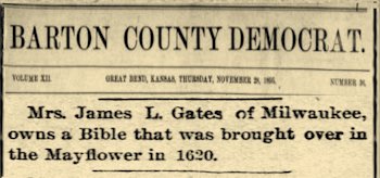 Mrs. James L. Gates (former Katherine Meade from New Hampshire) of Milwaukee, owns a Bible that was brought over in the Mayflower in 1620.