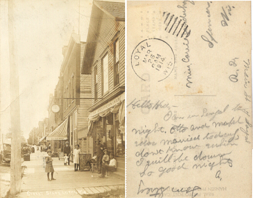 This antique photo postcard of "Main Street--Loyal, Wisconsin (1914), belonging to Tom Strey, carries the following details: