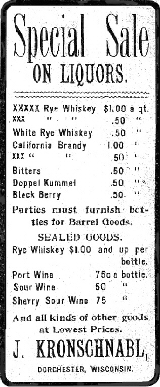 The advertisement above was scanned from "Clark County Herald," 21 Feb 1908, for J. Kronschnabl Liquors.