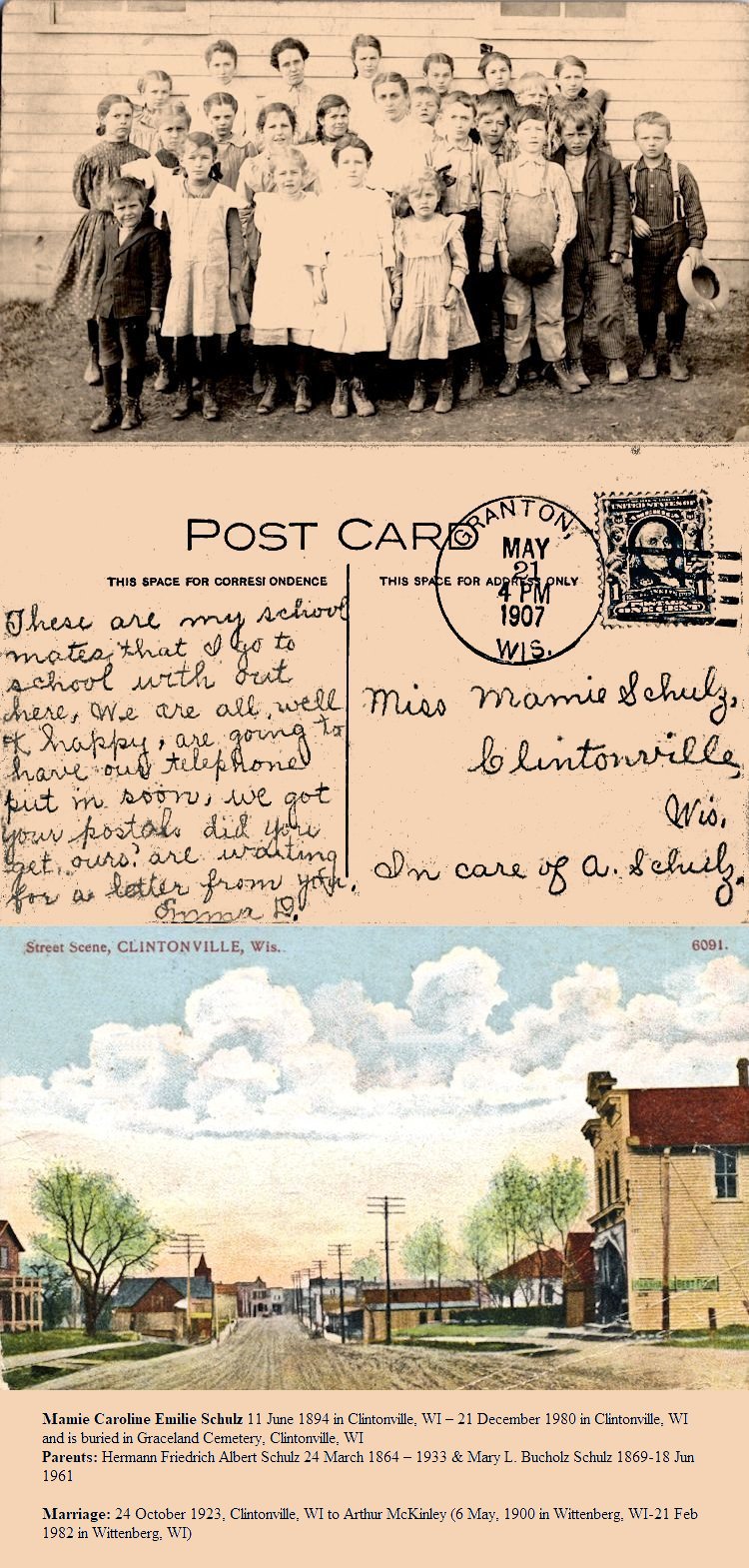 The postcard below was sent from Emma to Mamie Schulz in Clintonville, Wisconsin in 1907