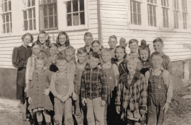 Teacher: Pearl Green - grades 1 through 8. Front Row: Patty Roder, Arlo Smith, Mel Appleyard, Evelyn Carl, Oakley Smith; Row 2: Teddy Meinholdt, Irv Marg, Wendell Roder, Donald Marg, Herb Smith, Delores Haas (Hause?) Jeannette Carl; Back Row: Mrs. Greene, teacher, Jeannette (Janett) Jeannine, Ralph Smith, Marie Smith, Everett Smith, Melvin Marg, Francis Laatsch. This photo and the identifications were provided by Sandra Little. |