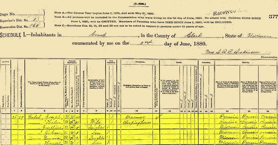 Friends and Close Neighbors 1880 Federal Census, Grant Twp., Clark, Wisconsin, United States, Sheet Letter: C, Sheet # 377, Person #: 0, Volume: 1, 2 Jun, Enumerator: Mrs. "Kitty" D. B. R. Dickinson