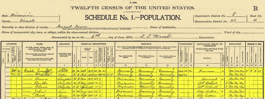 1900 Federal Census, Grant, Clark Co., Wisconsin; Sheet Number: 4, Number of Dwelling in Order of Visitation: 69, Family Number: 73