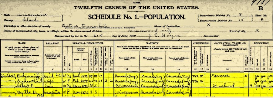 Myrtle H Hubbell Female 8 Single White Daughter B 9 Mar 1892 WI Canada Eng
