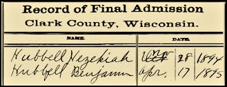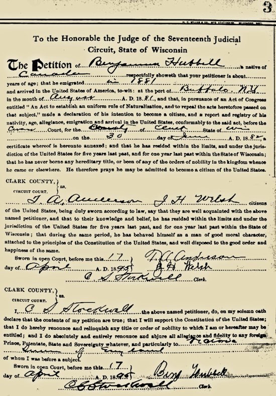 Benjamin Hubble emigrated to the United State in August of 1881 at the port of Buffalo, NY. He was naturalized 17 Apr 1895 in the Clark County, WI Circuit Court, about 6 months after Hezekiah Hubble was admitted. His Declaration of Intent was signed by Cyrus Simeon Stockwell. Theodore A. Anderson and J. H. Welsh testified that he had been in the country for at least five years, and for one year or more within the State of WI. They also swore to the court that in all that time, to best of their knowledge, Benjamin had behaved himself and did not carry on any unlawful activities.