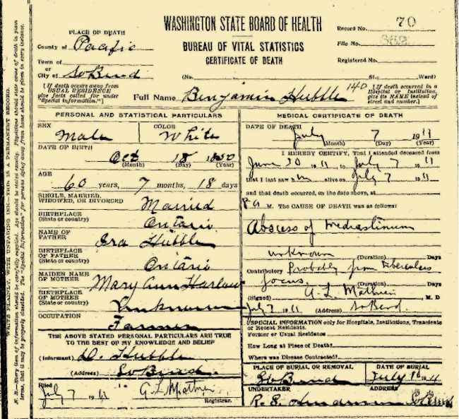 Obit: Hubbell / Hubell, Benjamin (18 Oct 1850 - 07 Jul 1911)