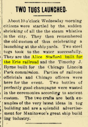 The "Alice Stafford" was christened by Miss Helen Dunkle, daughter of Mr. H.0.