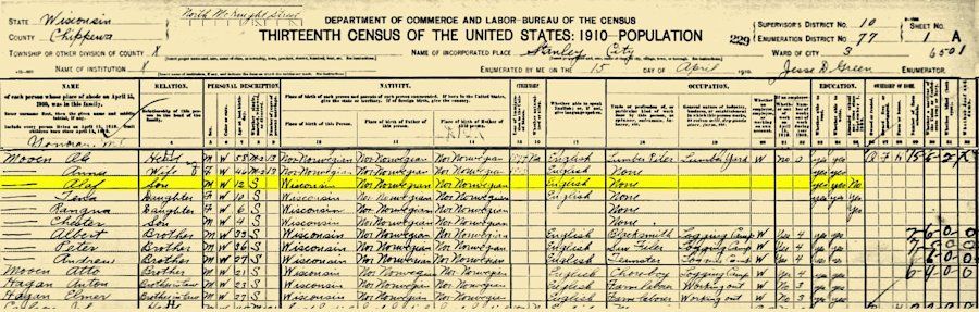 1910 Federal Census, WI Chippewa Stanley Ward 3 ED 77