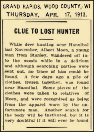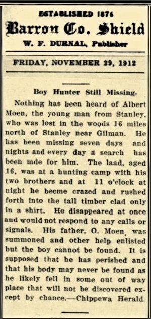 Albert Moen - Post card dated April 11, 1913. They found his body That Friday and burial was that Wednesday. [He was lost while hunting]