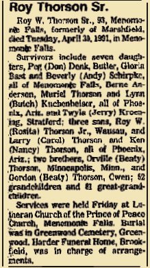 Roy W. Thorson, Sr., 93 of Menomonee Falls, formerly of Marshfield, Wisconsin died Tuesday April, 30, 1991 in Menomonee Falls. Survivors included seven daughters, Peg (Don) Denk, Butler, Wi., Gloria Bast, Menomonee Falls, Wi., Beverly (Andy) Schirpke, Menomonee Falls, Wi., Berne Anderson, Glendale, Az., Muriel Thorson, Phoenix, Az. and Lynn (Butch) Kuchenbeiser, Phoenix, Az. and Twyla (Jerry) Kroening, Stratford, Wi; three sons, Roy W. (Rosita) Thorson, Jr., Wausau, Wi, Larry (Carol) Thorson, Glendale, Az. and Ken (Nancy) Thorson, Glendale, Az.; two brothers, Orville (Beaty) Thorson, Minneapolis, Mn. and Gordon (Beaty) Thorson, Owen, Wi.; 52 grandchildren and 81 great-grandchildren. Burial was in Greenwood Cemetery, Greenwood, Wi.