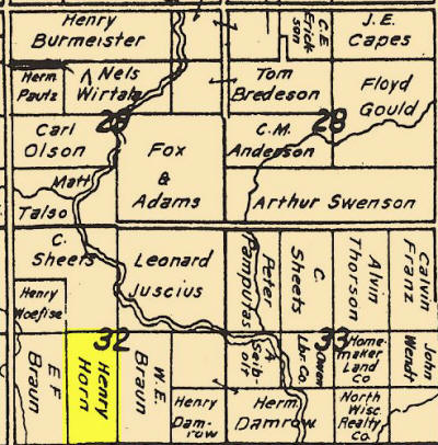 The Henry Horn farm was located in section 32, Rt. 3, Longwood Twp., Greenwood, Clark Co., Wisconsin. It was later farmed by his son, Lloyd and by 2012 it had been sold to an Amish family.
