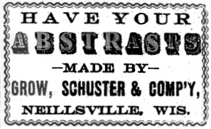 The advertisement below ran in the Thorp Courier 7-Oct-1909 and feature the Grow & Schuster Abstract business. If you can add any history f this company, or supply the given names of the owners, please let us know.