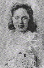 To the strains of Lohengrin’s wedding march the bride walked down the church aisle to the altar accompanied by her uncle, August JOHNSTON, of Oakland, CA, who gave her in marriage. Her gown of heavy white satin was styled with a bouffant organdy skirt which extended into a long train. Organdy ruching outlined the square neckline and her fingertip veil of tulle was caught to a small sweetheart hat. She carried a colonial bouquet of gardenias and stephanotis.