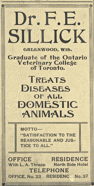 Mr. Sillick was born in Teeswater, Ontario, Canada, Oct. 13, 1880, and came to Wisconsin 34 years ago. He had made his home in Neillsville for the past 25 years. He received his early education in Canada and at the age of 26 entered the Veterinary College at Toronto. He was graduated from that College with honors. He was naturalized in Wisconsin.