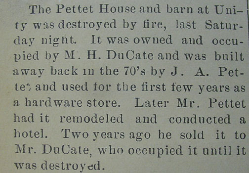 The Petter House and barn at Unity was destroyed by fire, last Saturday night. It was owned and occupied by M. H. DuCate and was built away back in the 70's by J. A. Pettet and used for the first few years as a hardware store. Later Mr. Petter had it remodeled and conducted a hotel. Two years ago he sold it to Mr. DuCate, who occupied it until it was destroyed.