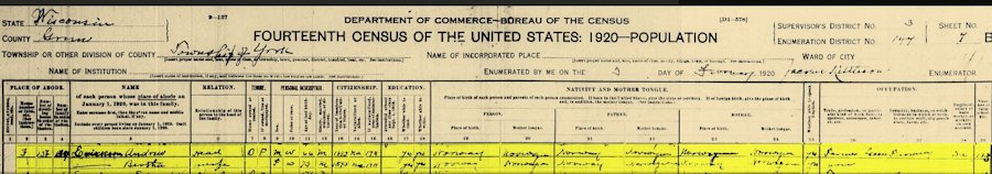 1920 Federal Census, Green, Wisconsin, United States, Sheet Letter: B, Sheet Number: 7
